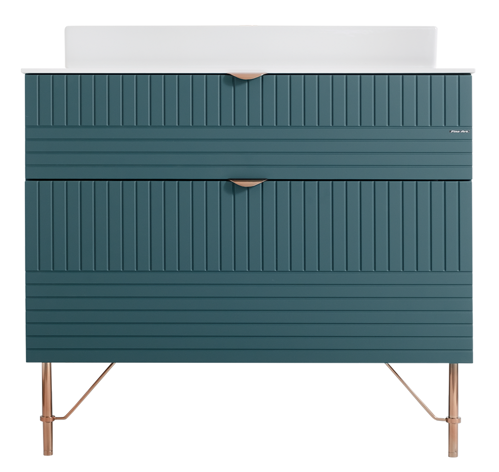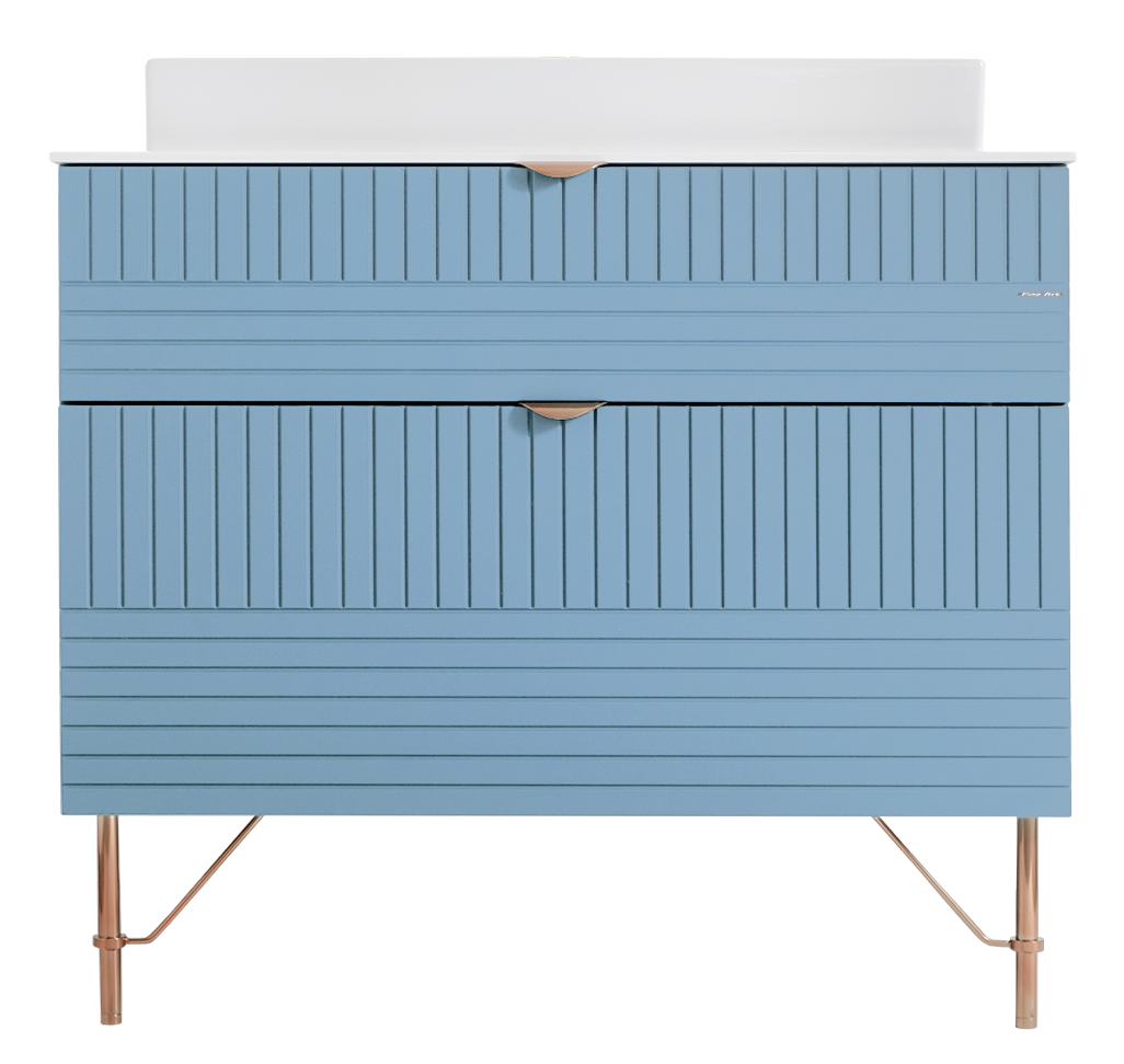 The body of the LINE cabinet is made of MDF boards with PVC foil, while the countertop is a compact board. The legs and handles are in gold color. The sink is made of ceramic.